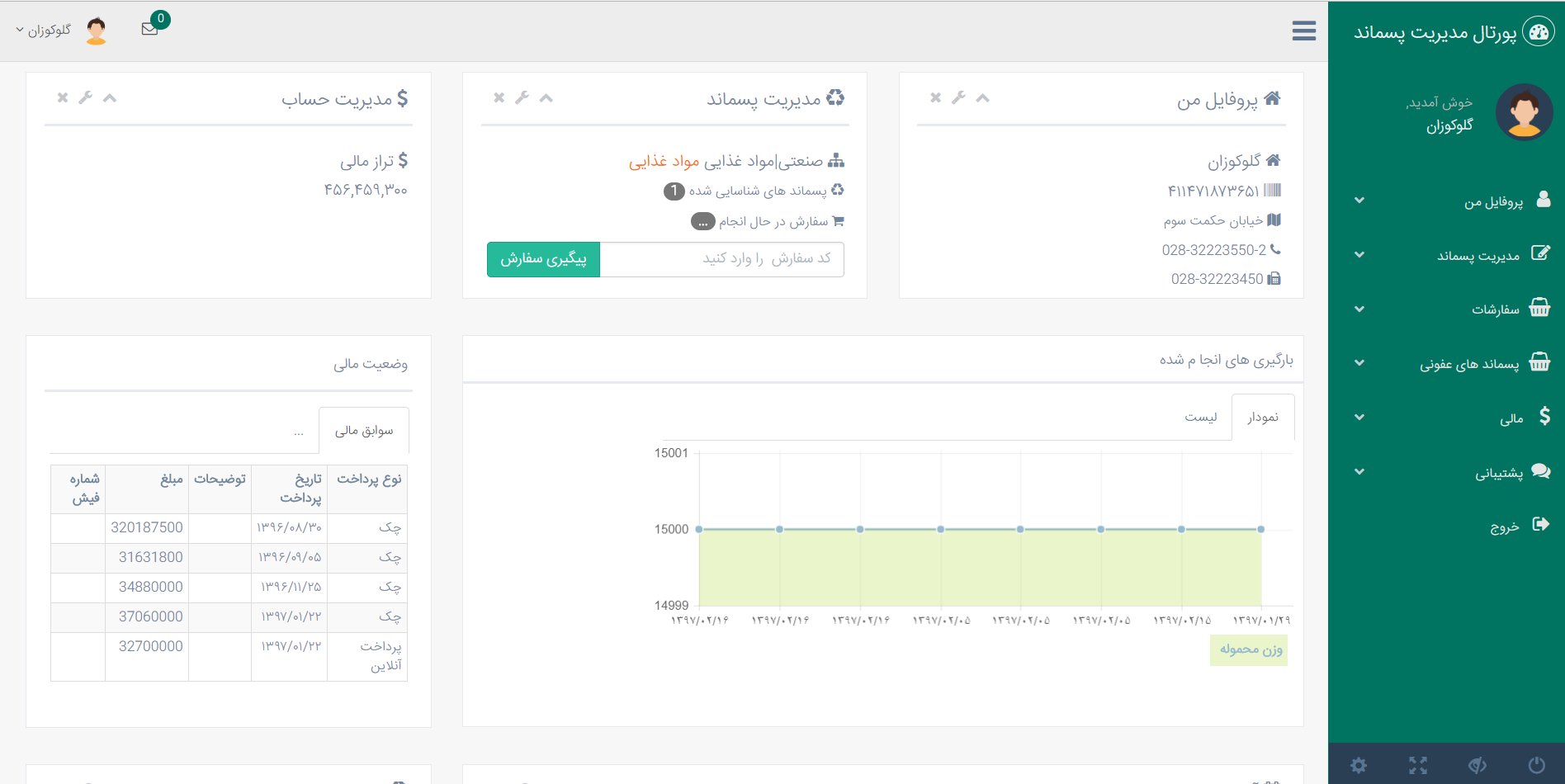 نمایی از نرم افزار مدیریت پسماند (پنل تولید کننده پسماند) - بخش صنعتی (گروه مواد غذایی)